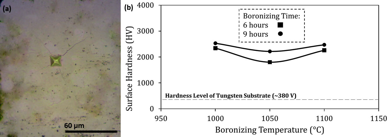 - Tremendous improvement of surface hardening obtained after boronizing.